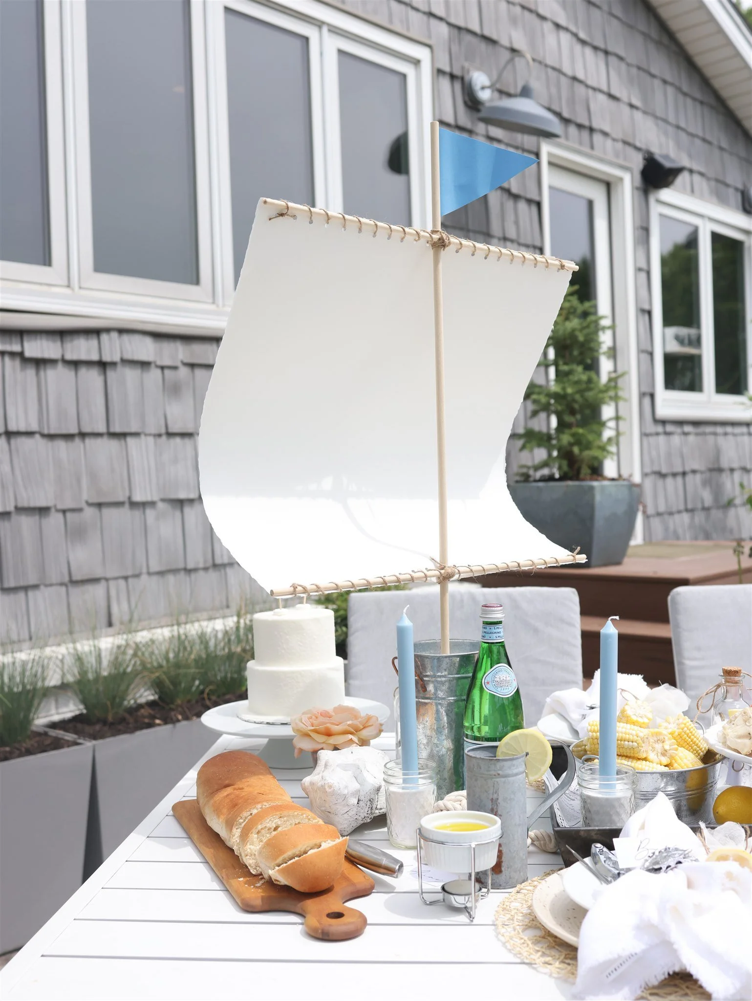 August is here, and it’s a great time to gather family or friends to soak up those last days of summer. I love family-style meals such as a crab boil this time of year. The food is the star of the show and a vital part of the tablescape – decor optional! Additional elements included here are a large paper-sail, light blue taper candles, a few large flowers, and heavy white rope as nautical accents. You can also use other elements such as large seashells, coral or seaglass. Use whatever you have on hand that nods to the sea.