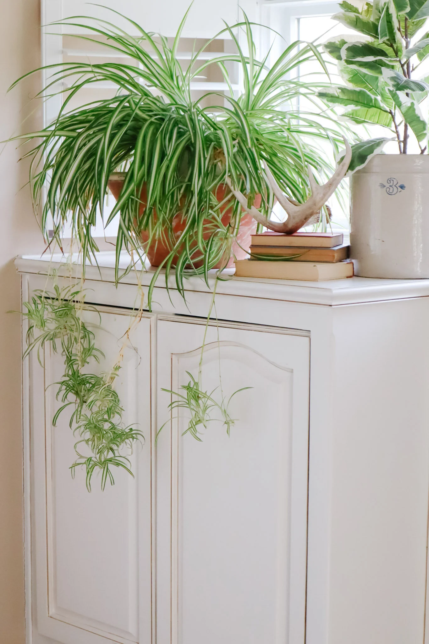 General growing tips for the beginner… 1) The Seasonal Cycles are not just in the outdoor plant world! Did you know that indoor plants go through seasonal cycles too? Indoor plants require regular water and fertilizer in the summer and then go through a dormant period in the winter requiring minimal water and fertilizer. My seasonal rhythm is to treat Oct-February as dormant months and March-Sept as growing months. 2) Watering: The number one way folks kill their plants is by overwatering. Don’t be a wet blanket! Literally. Make sure to test your soil (with your finger or this little tool) before watering to make sure that you don’t over do it. Soggy soil kills. It helps me to pick one day of the week as watering day so I don’t accidentally overdo it. I’ve been doing Water-Wednesdays for years! As a general rule, water 1x per week in the growing months and 1-2x per month in the dormant months. Finding an app such as Planta (free) or setting an alarm reminder on your phone can also help to manage your itch to overwater. 3) Fertilizing is key. We don’t live on water alone and the same is true with plants. Plants need water AND food to thrive! I use a general indoor liquid plant food and simply add to my plants water as recommended on the label. 4) Double pot your plants to avoid root rot as well as having water leak onto your floors and shelves. Keep your plant in a plastic pot with drain holes and then place that pot into a larger pot without drain holes. Now everyone is happy! Also, repot your plant yearly (or as needed) as they outgrow the current one lived in. 5) If bugs and fungi creep in then spray my plants with Neem Oil according to directions. I’m not going to lie, this stuff stinks like crazy. But, it takes care of a multitude of problems without the use of chemicals and your plants will thank you.