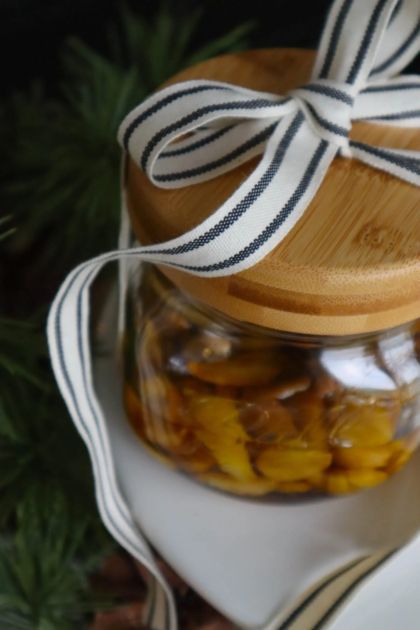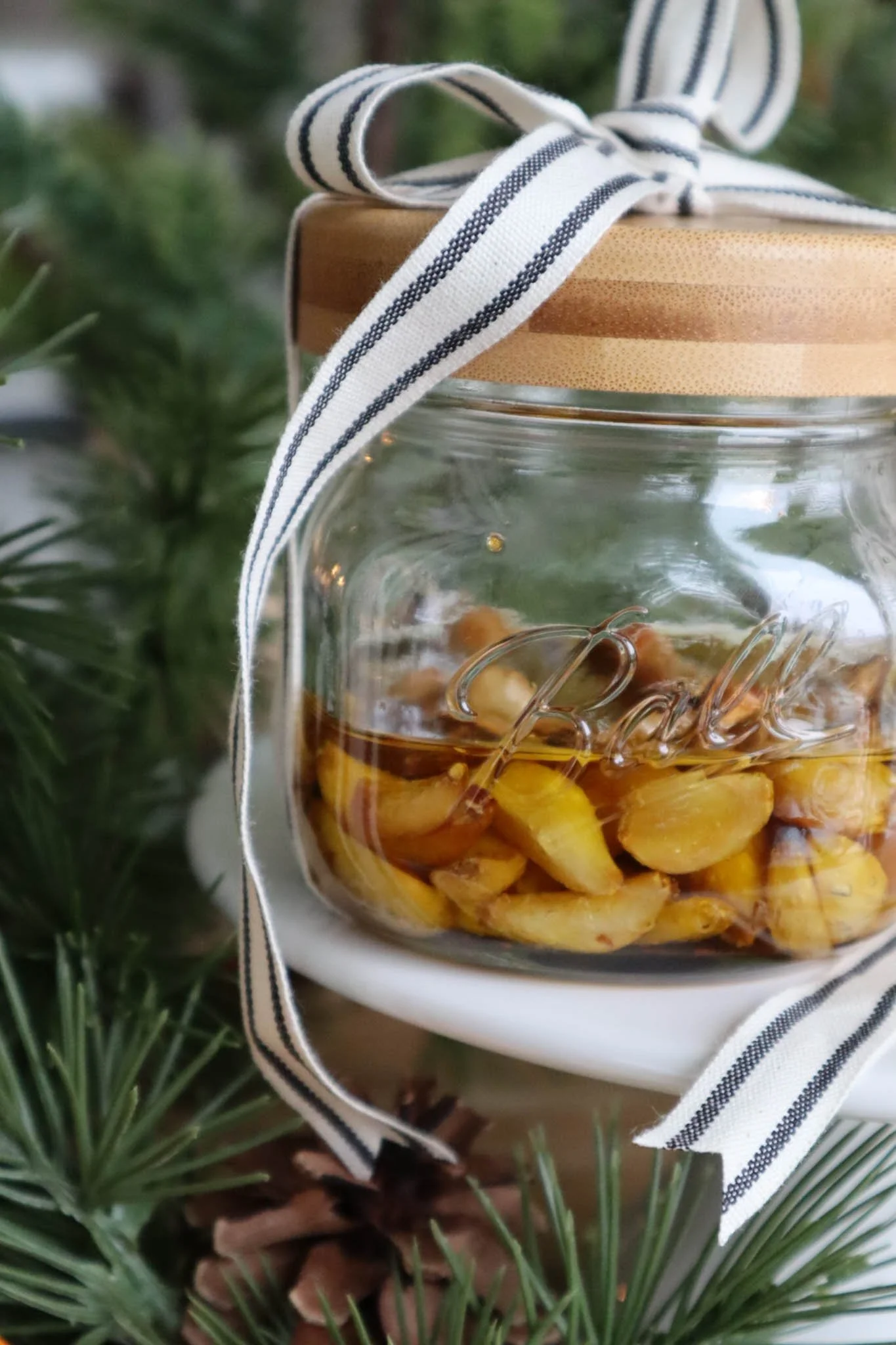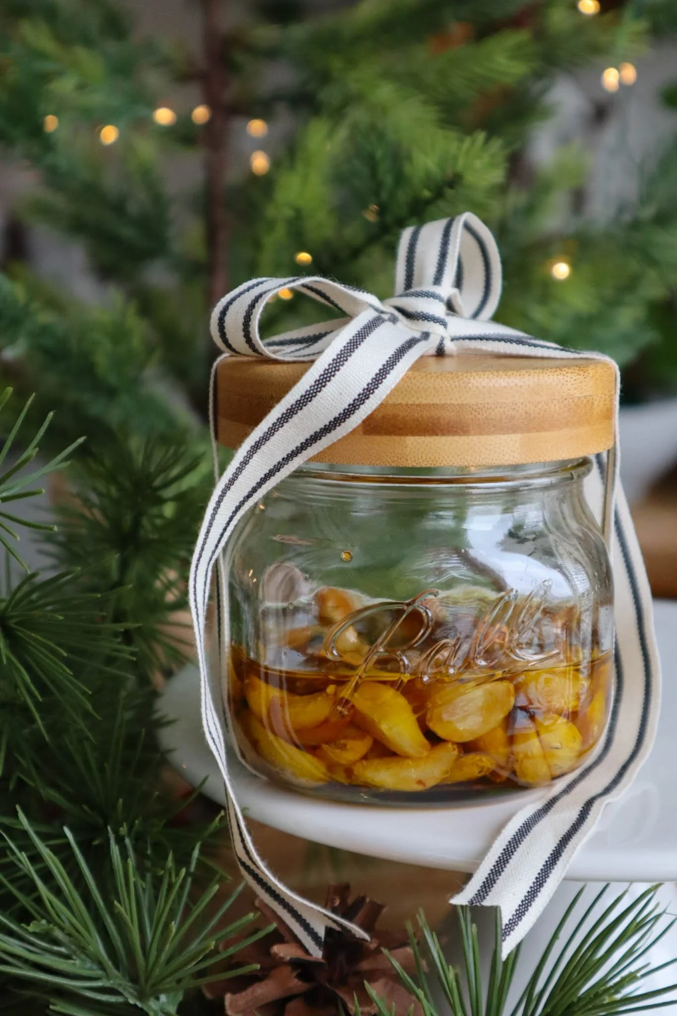 If you just can’t get enough… share it! I’m always looking for a great host/hostess gift this time of year. Roasted garlic is adorable tied with a bow and gifted in a basket along with pasta noodles, a favorite past sauce, fresh bread and a tea towel. To “wrap” roasted garlic, I like to place garlic in a widemouth mason jar and top with a bamboo lid. Tie with your favorite cotton ribbon and its ready to be gifted.